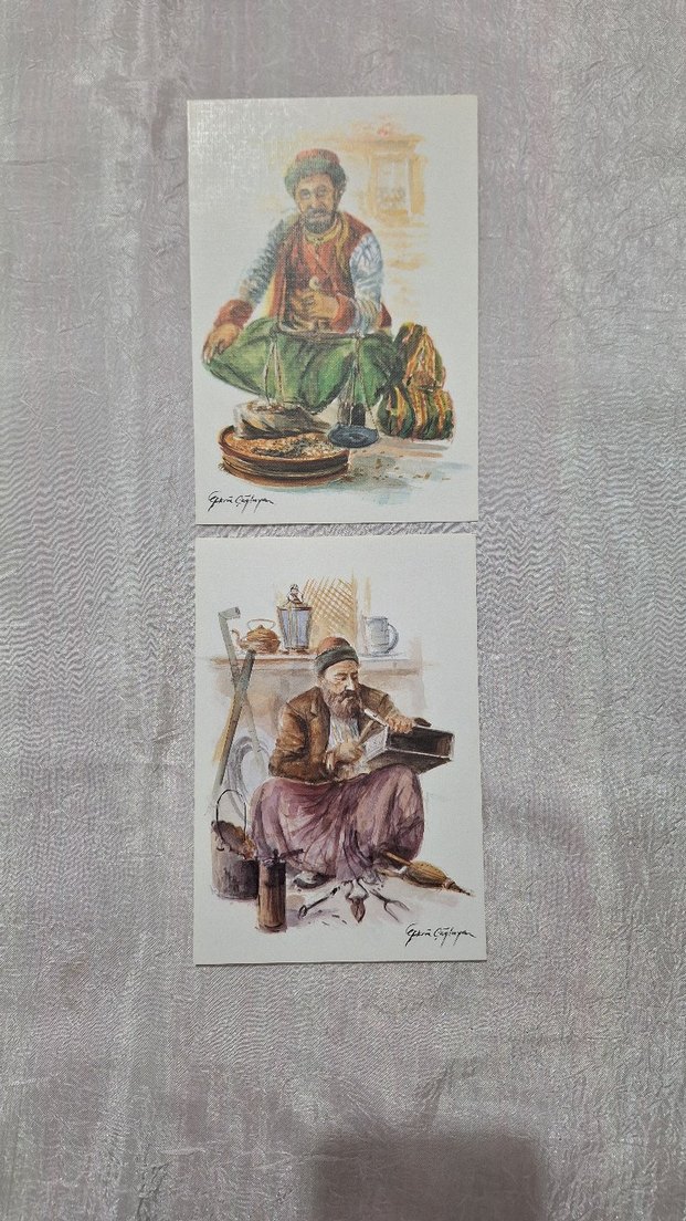 Sanatçının imzasını taşıyan, geleneksel sahneleri betimleyen iki detaylı kültürel temalı kartpostal.