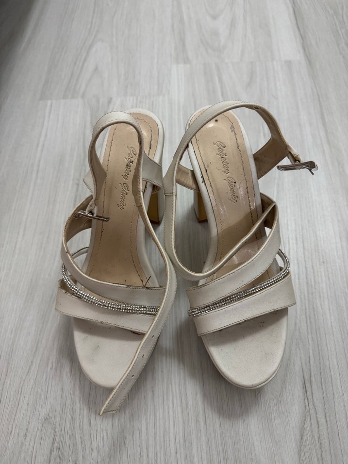 Beyaz stiletto topuklu abiye ayakkabılar, parlak yüzey ve tokalı detaylara sahiptir. Minimalist ve bohem tarzıyla düğünler için uygundur.