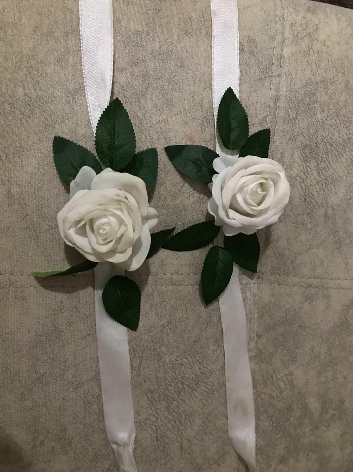 Beyaz kurdele üzerine yerleştirilmiş beyaz güller ve yeşil yapraklarla klasik ve minimalist düğün aksesuarı.