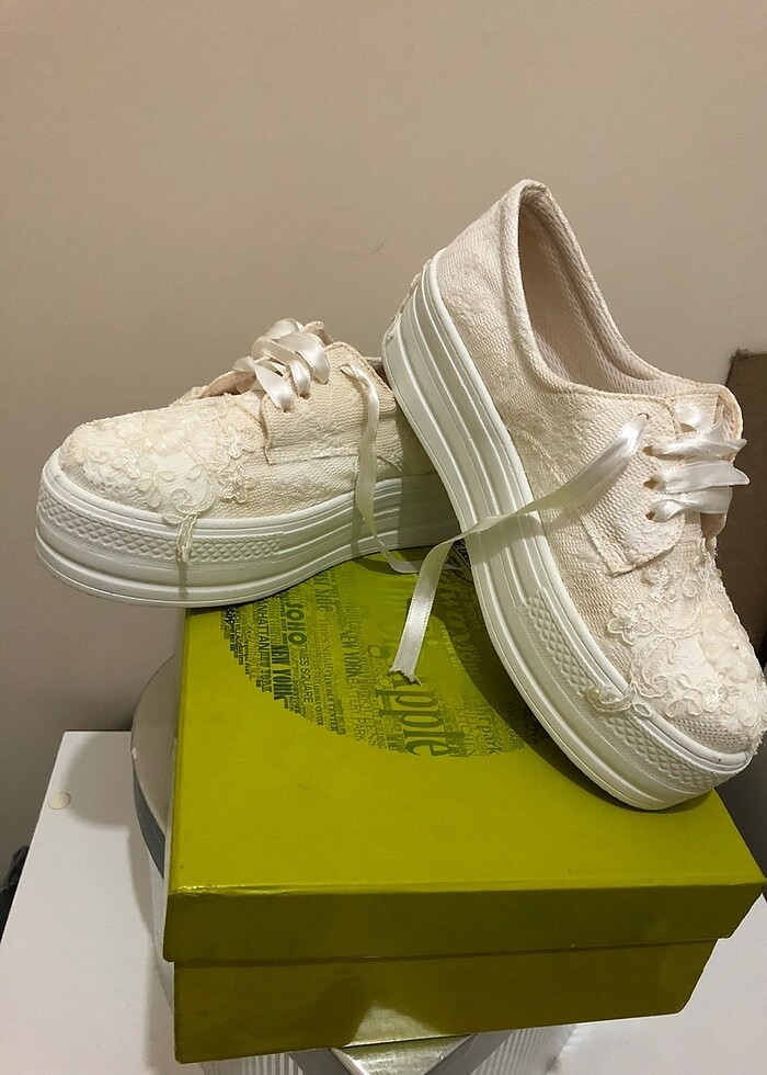 Converse tarzı gelin ayakkabısı..Uygulamadan aldım ancak ayağıma olmadı,aldığım kişi sadece 2 saat giymiş,rengi kırık beyaz,tertemiz bir ürün.