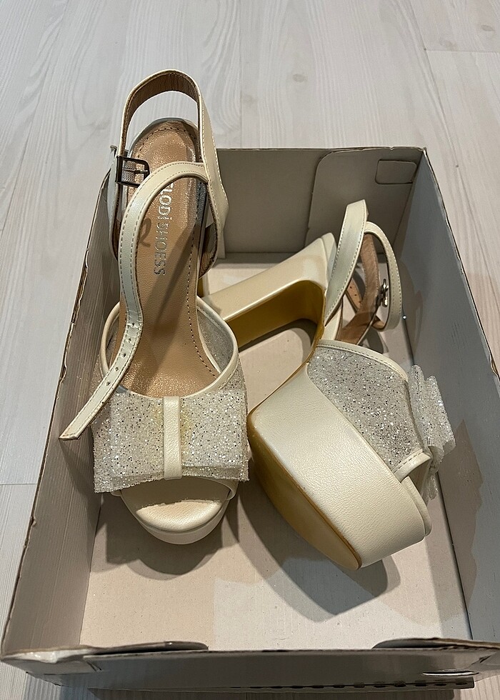 Hiç giyilmedi. Kendi düğünüm için almıştım ama sakatlandigim icin giyemedim. Alti tertemiz. Çok rahat. 11 cm topuğu var. 2500 tl ye alınmıştı. Fotodan kat kat guzel bi ayakkabi