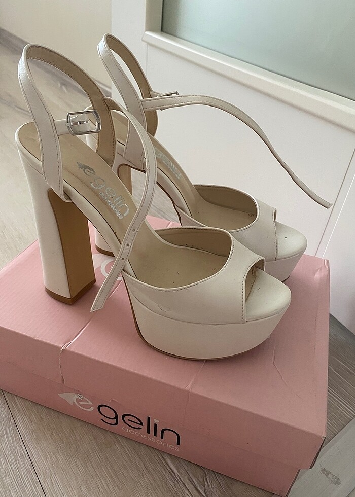 Egelin marka gelin ayakkabısı bir kez düğünde giyilmiştir 14 cm kalın topuktur rahattır kargaşada bir ayakkabı 37 biri 38 alınmış şimdi fotoğrafta çekerken farkettim topuk boyu 14 cmdir