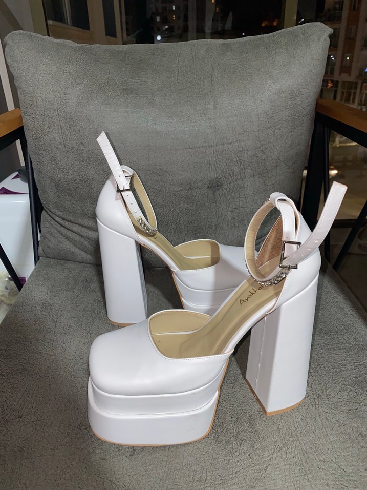 Beyaz, tokalı bantlı ve suni deri platform topuklu kadın ayakkabısı. Gelin ayakkabısı sadece 1 kere salon düğününde giyildi. Sağlam ve temiz durumda. 39 numara geniş kalıp.