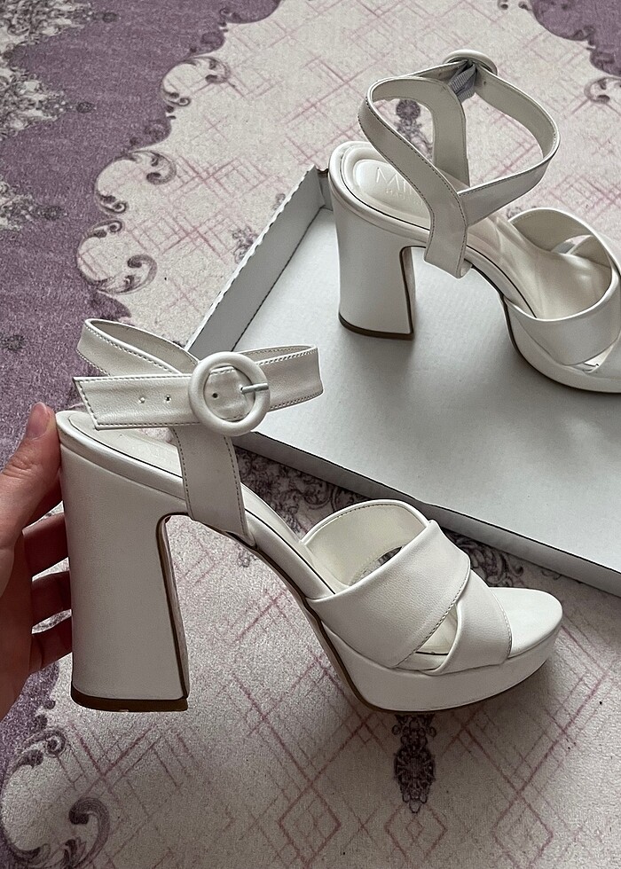 Topuk boyu 10cmdir. Yalnızca bir gün düğünümde kullandım. Gayet temiz ve defosuz. Kutusu ile birlikte göndereceğim. Bilek ayarlanabilir. 38 numara ama normalde 37 giyiyorum bana da rahat oldu. Zıpır zıpır zıplamama rağmen gayet rahat idi.