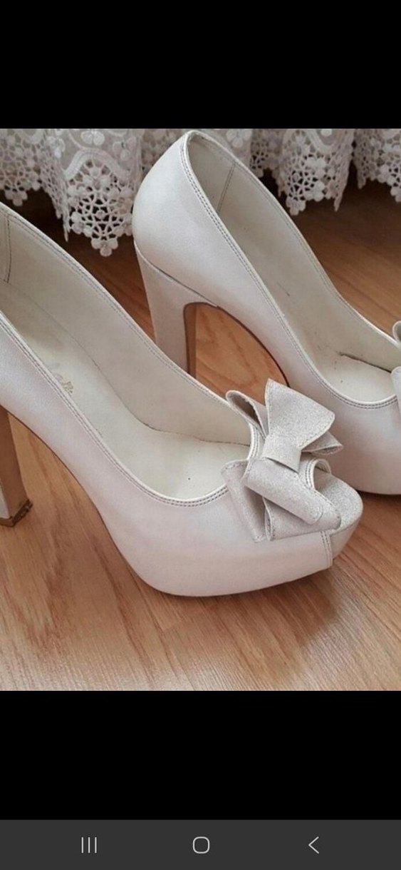 Sadece nikahımda ve çekimde kullandım. Topuk kısmı ve önündeki fiyonk simli. 13/14 cm topuk boyu. 38 numara özel yapım oldukça rahat.