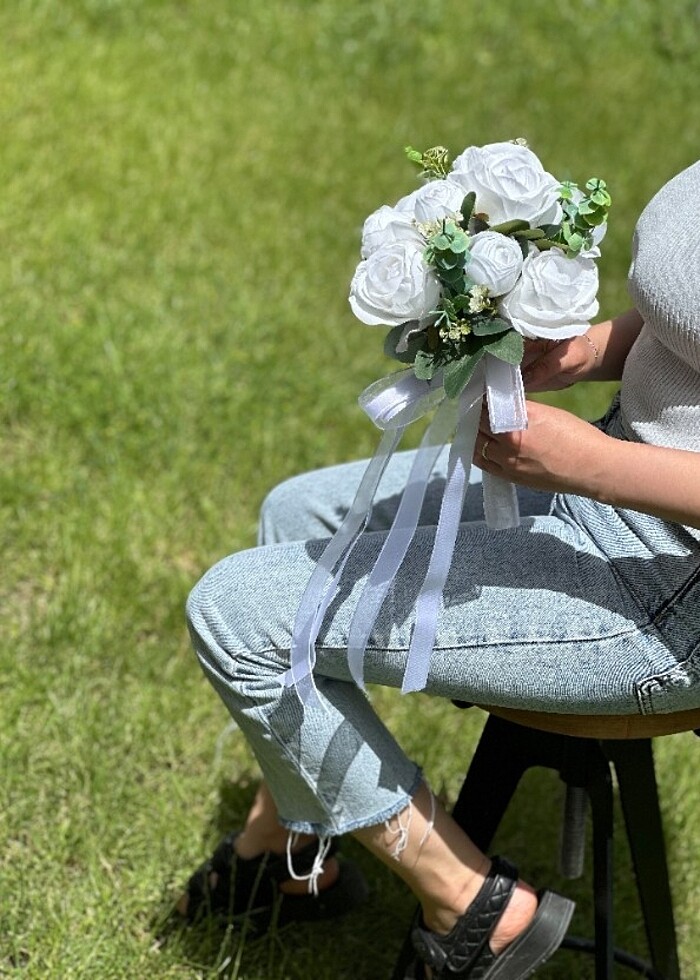 Beyaz gül ve erengül uyumlu beyaz buket, yapay okaliptüs ile süslenmiştir eşi benzeri yoktur istoriabridal ürünüdür