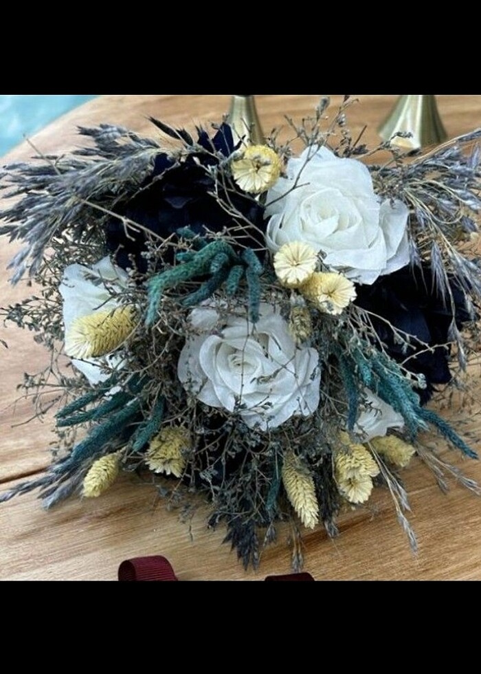 1 kere nişanda kullandım.Kurutulmus çiçektir.Dokulme çok yapmaz.Turkuaz lacivert tonlarında kıyafetlerle uyumludur.Aralarinda beyaz güller ve kuru ince çiçekler var.