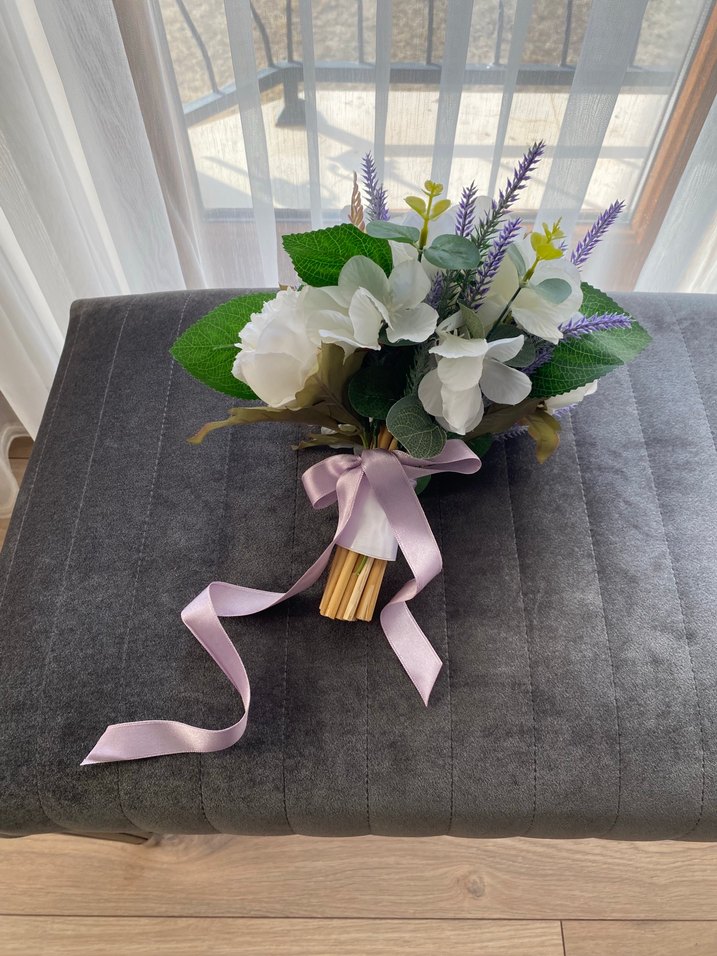 Şakayık, ortanca ve lavantalardan oluşan bir gelin buketi. Gelinlikle uyumlu olabileceği gibi; beyaz, Lila veya mor renk abiyelerle şahane bir uyum yakalayacaktır. Tutma yerindeki fiyonk kurdeleyi lila tercih ettim ama beyaz olsun derseniz değiştirebilirim de Hiç kullanılmadı, satmak için kendim hazırladım. Sipariş üzerine değil, görselde gördüğünüz çiçeğin kendisi gelecektir