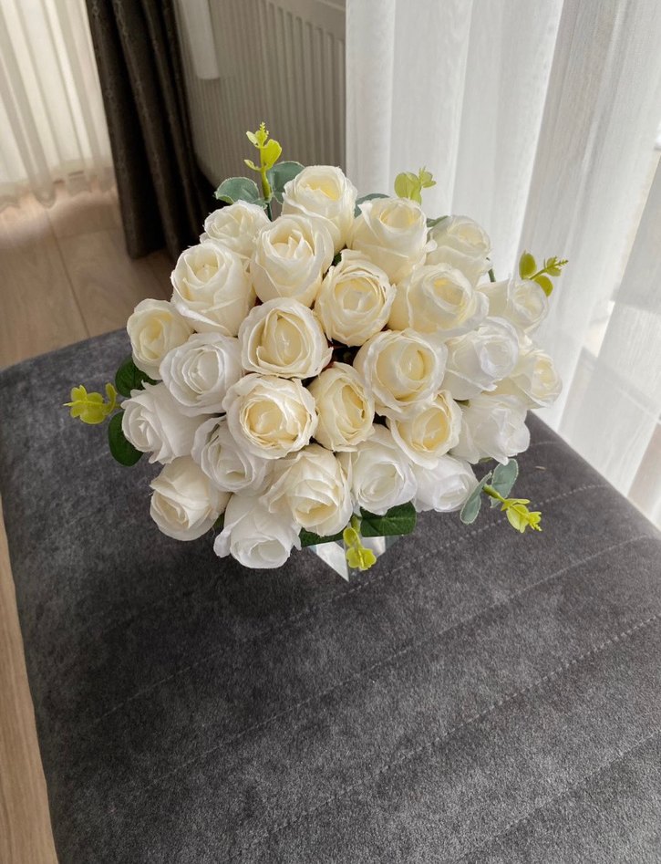 26 adet gonca gül ve okaliptus yapraklarından oluşmaktadır. Tutma yerinde saten ve organze kurdele kullanılmıştır. Sıfırdır kullanılmamıştır. Görselde gördüğünüz çiçeğin kendisi gönderilecektir. Satmak için kendim hazırladım. Son görseldeki buketlerin hepsinin ilanları sayfamda mevcuttur. Zarar görmemesi için kutuda gönderilecektir