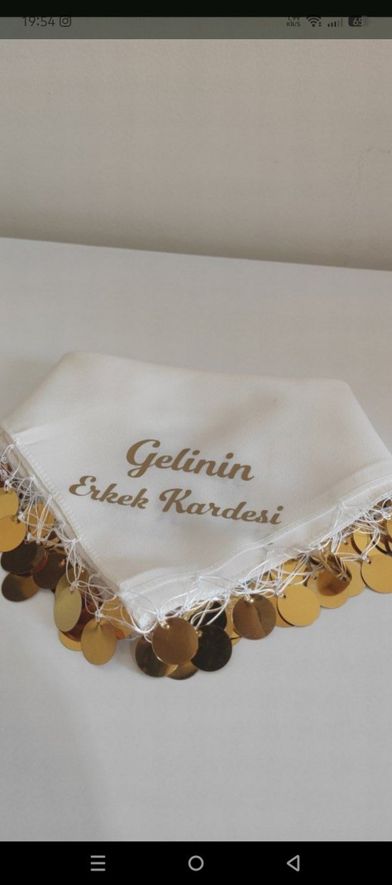 Parlak altın renkli pamuk fular, pul detaylı ve mütevazı stile sahip, üzerinde 'Gelinin Erkek Kardesi' yazısı bulunur. ✨