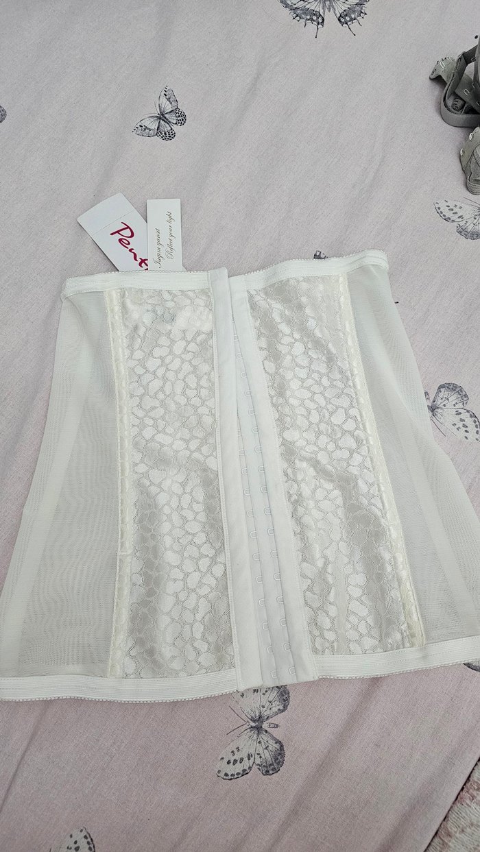 Beyaz renkte, nakışlı detaylara sahip kısa ve vücuda oturan emzirme korsesi. Hafif ve şık bir tasarıma sahiptir. bridal korse