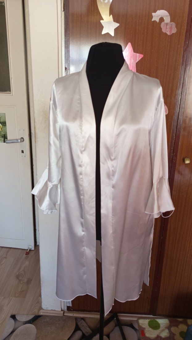Kol dikişleri biraz sökülmüş...Uzun, bol kesim kadın sabahlık, uzun kollu ve parlak saten kumaştan yapılmıştır. Minimalist ve bohem tarzda, desensiz ve şık bir tasarıma sahiptir. ✨