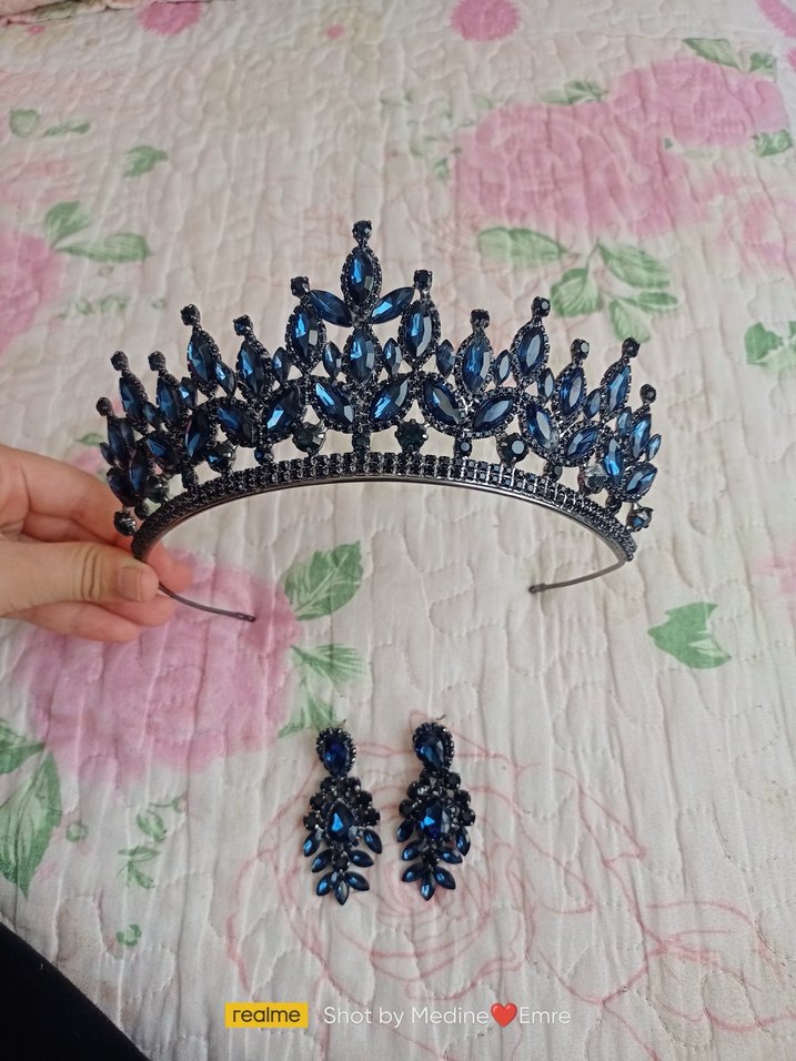 Lacivert renkli parlak gotik tarzda taç ve uyumlu küpe setidir. Bohem, hippie ve retro stillere uygundur. Daha yenidir kırık çıkık yok