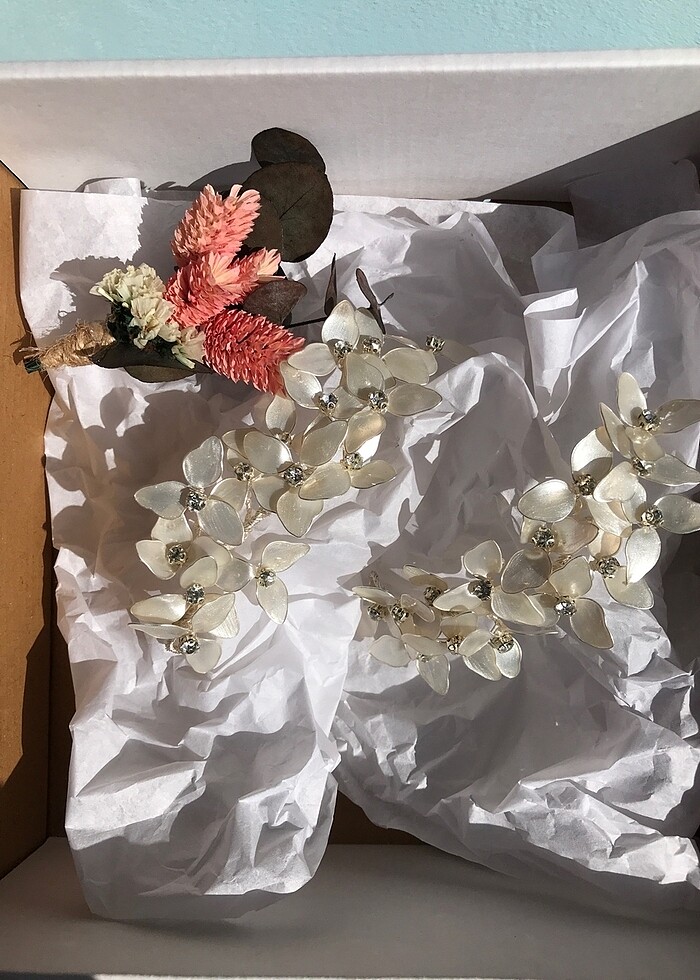 El yapımı özel tasarım bi ürün, sadece nişanımda kullandım. Kırık beyaz bi rengi var.