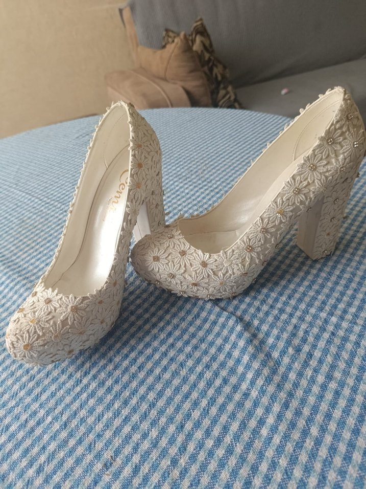 Dantel işlemeli, beyaz kadın topuklu ayakkabı. Rahat kauçuk malzeme ile yapılmış, klasik ve vintage tarzlara uygun, düğün için ideal.