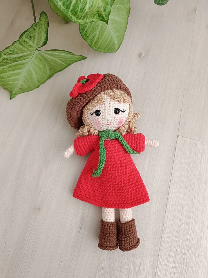 Kahverengi şapkalı, kırmızı elbiseli, kahverengi botlu, örgü renkli bebek. Örgü saçları ve yeşil atkı detayı bulunur.
