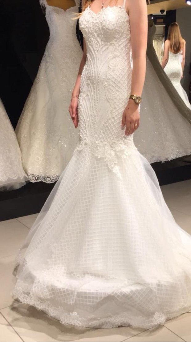Emine Yıldırım tasarımlı canım gelinliğimi dolabımı boşaltmak için satıyorum uzun kuyruklu arkasına kuyruk tutacak detay eklenmişti file detaylı inci boncuk işlemeli ince askılı harika rahat bir gelinlik.boyum 165 bedenim 36 ayakkabım hemen hemen 6-7 cm’di o görselde
