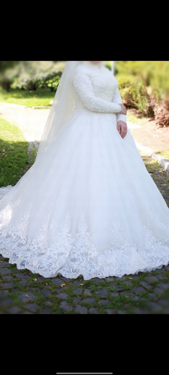 Uzun kollu A kesim gelinlik. İnce dantel detaylı, beyaz kumaştan, şık ve zarif bir seçim.