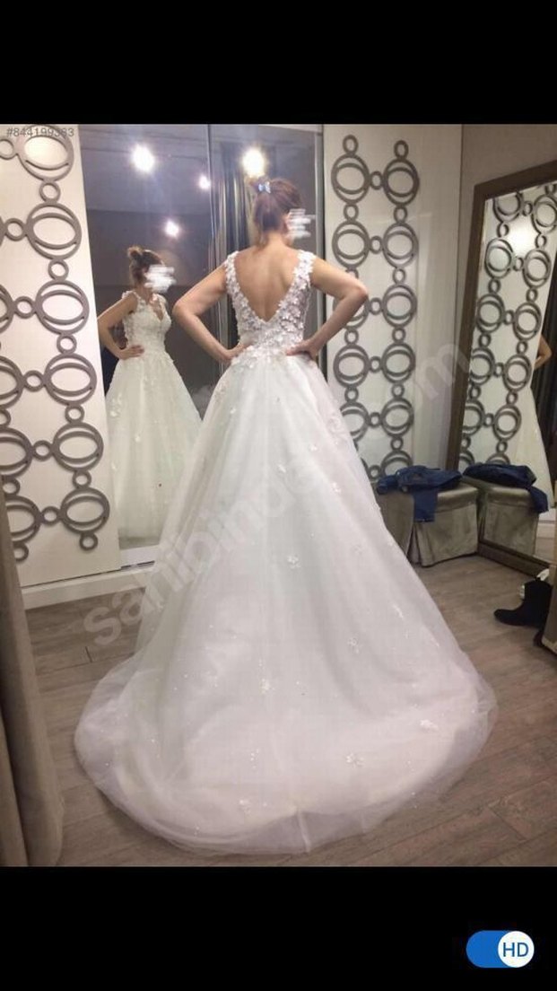 V yakalı, askılı, beyaz midi uzunlukta A kesim gelinlik. Klasik şıklık ve gösterişli tarzıyla, vücuda oturan model. özel olarak dikildi ilk giyen kişiyim Nişantaşı'nda beyaz butik de yapıldı gelinliğin duvağı da var uzun onun resmini koyamadım tasarım tarlatani da var