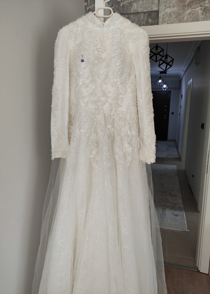 Hiçbir deformesi yoktur , özel dikimdir, tamamen kristal taşlar işlenmiştir, 40 beden için yapılmıştır lakin arkasındaki ek kumaş sayesinde 38 ve 42 bedenler de tercih edebilir