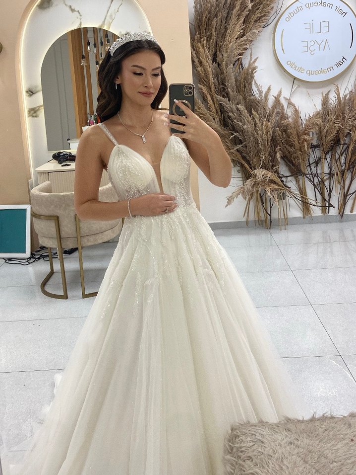 Aysira gelinlik nikah icin kullanıldı. 36 tam bedendir. İnci detay islemeleri mevcut. Rahat ve şık bir model. Kırık beyaz rengidir. Rahat yürüme icin tarlatan vardır. Etiket duruyor.
