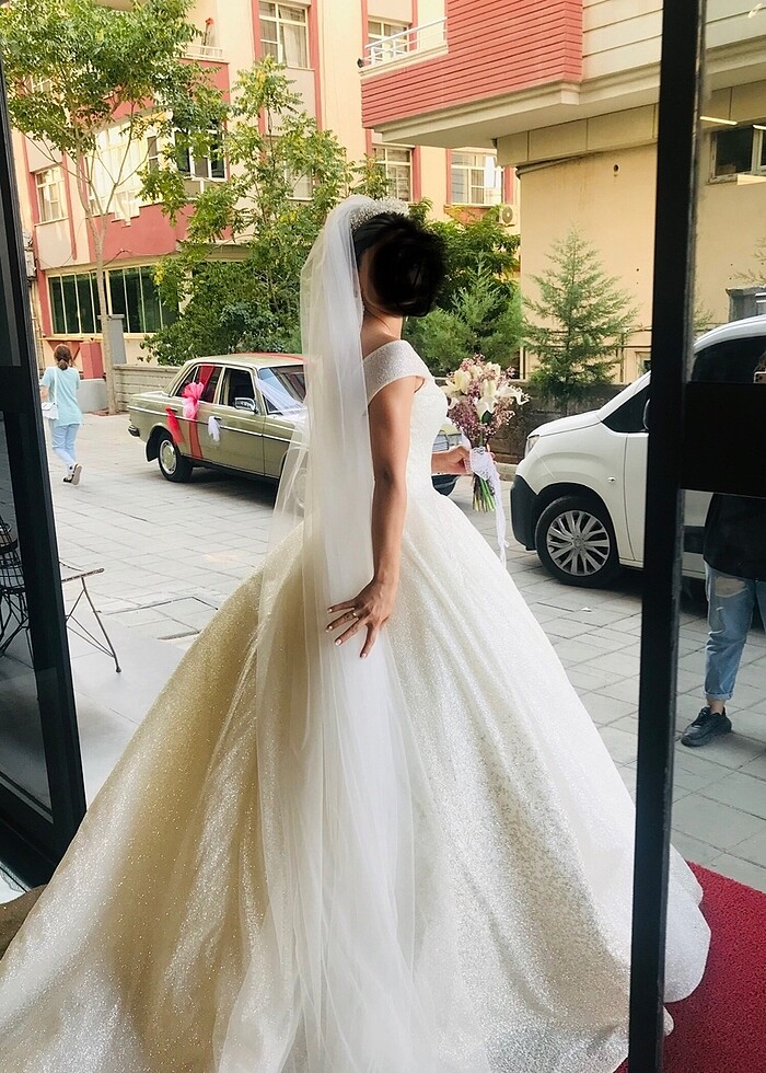 Prenses model sadece ışıltılı gelinlik özel yapım olup sadece düğünde giyildi herhangi bir deformasyonu yoktur kuru temizlemesi yapılıp paketlendi dileyene daha detaylı fotoğraf video gönderebilirim arkası ipli olduğu için s m bedene uyumludur