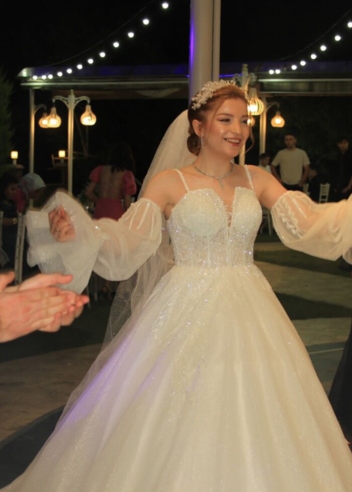 Gelinlik özel dikim İki tane duvak biri simli biri sade gelinlik ile birlikte yollanacak kullanmış olduğumuz iki tane saç aksesuarları da dahil olmak üzere taç ve ikili toka. Kuru temizleme yapıldı tarlatan içinde düğün olalı bir ay oldu kolları kişinin tercihine göre çıkartılabilir 1.55 boy ile 15 cm topuklu ayakkabı ile giyildi. Gelinlik çok rahat içiniz rahat bir şekilde alabilirsiniz dilerseniz instagram üzerinden de gelinliğin video ve resimlerine bakabilirsiniz