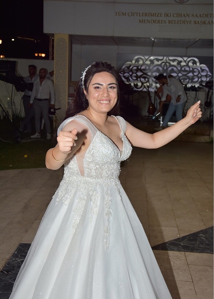 Bir kere giyildi aynı gün hem düğün hem çekim yapıldı. 38-40 beden uyumlu. Eteği kendinden simli. Yan kollar çıkabilir isteğe bağlı. Kuru temizleme yapıldı.