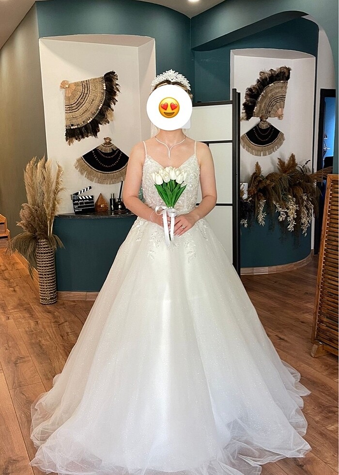 Bir kez giyildi etek kısımları simlidir kolları askılı inci detaylı üst kısmında inci ve taşlar mevcut harika bir üründür s-m uyumludur
