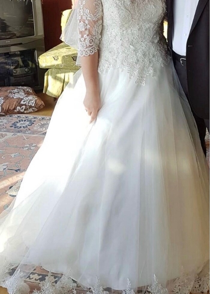 Gelinliğim sadece 6 saat giyilmiştir yırtık sökük lekeli bir yeri yoktur hazır dikim degil özel dikim yaptırmıştım etek ucunda fransız güpürü kullanıldı özel olarak getirtildi 75-82 kilo arası kisilere olabilcek bedende sırtında inci düğmeleri mevcut üst beden kısmında dantel icinde gozukmeyen ama hafif parlaklik veren pullar mevcut ciddi alıcılar ile pazarlık yapılabilir kuru temizleme yapılmadı bilginize.40-44 arası bedenlere olur