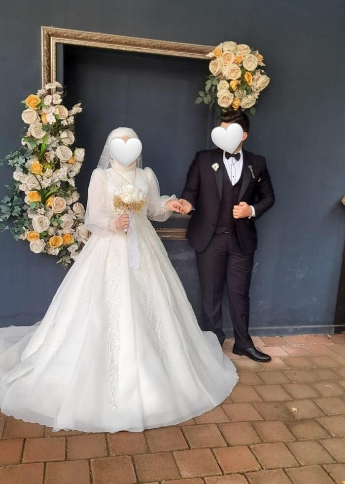 Gelinlik 1 kez giyildi 40 bedendir hafif boyun kısmında yırtık var belli olmuyor .Yanında duvağı ve tacı gönderilecektir.