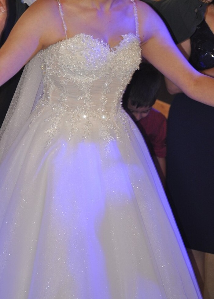 2 farklı düğünde kullanıldı. A kesim tül ışıltıları olan zarif bir gelinliktir. Arkası iplidir. İp askılı gögus kısmı taşlıdır. 36-38 beden uygundur Pazarlık payı vardır. Etekleri ışıltılıdir. Tarlatanı gelinlikle birlesiktir. Düğün sonrası kuru temizlemeye verilmedi kullanıma bağlı etek uçlarında tozlanmaya bağlı siyah lekeler mevcut ve koltuk altında sarı lekelenme vardir Kılıfıyla birlikte verilecektir. İçeriği gelinlik, 2 duvak biri gelinliğin kumaşından taraklı diğeri uçları taşlı duvak, 2 tül kol ve yedek gelinliğin ipi