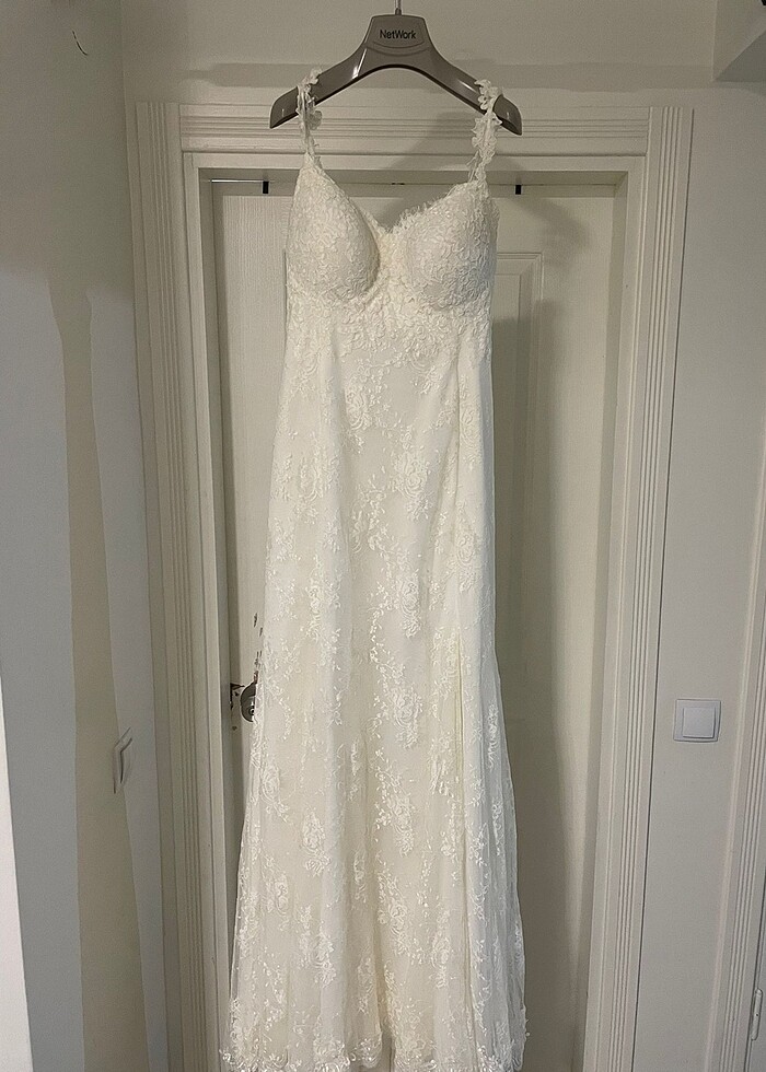 Özel dikim gelinlik, 36 beden. 85C cup göğüs uyumu. 174boy için babet ile giyilmeye uygun dikildi. Arkası kuyruklu. Arka iç kısımda görünmeyecek yerde lekeler var kuru temizleme ile çıkabilir. İç göğüs kısmında kırmızı konfeti yapışmasından kaynaklı leke var, dış kısımda belli belirsiz görülüyor kuru temizleme ile çıkabilir. Markası Sisters wedding İzmir.