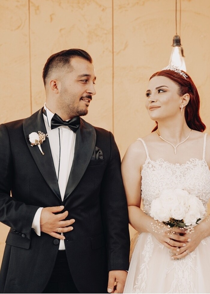 Düğünümde kullandım,duvak ve tarlatanıyla birlikte satıyorum. Önünü kapattırdım isteğe göre açılabilir,fermuarlı olup 36-38 beden uyumludur. 1.58 boy 58 kilo ve 5 cm topuklu ile kullandım.