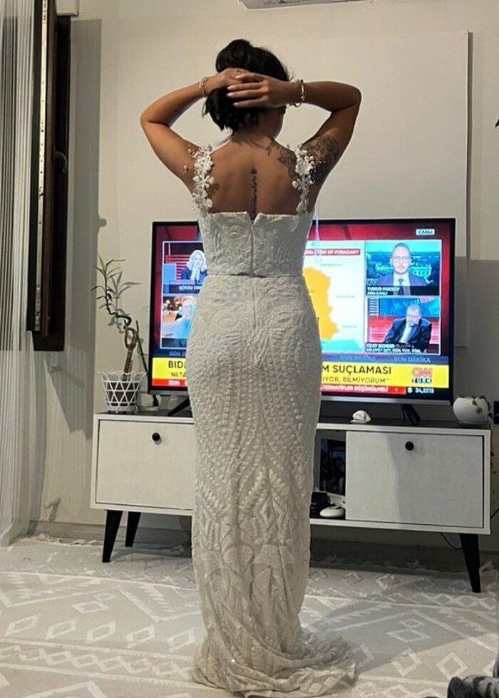 Sadece 2 saat giydim. 1.61 boy, 52.5 kg üzerime tam oturuyor. yere sürtünen yerleri biraz toz oldu o kadar başka hiç kusuru yok . İşlemeleri kırık beyaz renkte minik pullardan yapılmıştır. 15 cm'e kadar topuklu giyebilirsiniz eteği uzun. Askıları takıp çıkarılabilir, çıkık vaziyette yanında göndereceğim. Duvağı ve beyaz kürk şalı ile beraber göndereceğim.