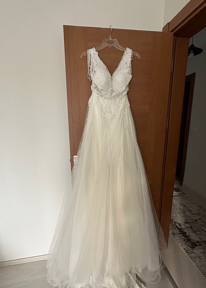 Ürün sadece bir kez düğünde giyildi, sonrasında kuru temizlemesi yapıldı. Kendi bedenime göre özel dikilmişti. ( 1.64 boy- 54 kg uygun) 34-36 beden olanlara rahatlıkla olacaktır. Gelinlik belden oturtmalı A kesim bir model, eteklerinde şerit şerit zarif işlemeleri, omuz ve yaka detaylarında zarar görmemiş bir şekilde taş işlemeleri mevcut durumda. Gelinlik ile birlikte kullandığım duvak ve gelin tacımı da göndereceğim. Muğla-Merkez’de alıcı olursa elden teslim edebilirim.