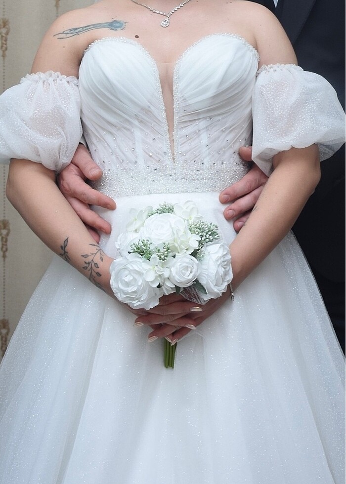 Straplez model S-M bedene uyumlu eteği simli tülden. Görseldeki seyyar kol mevcuttur. Simli tülden 1.5 mt duvağı ile verilecektir. Fiyatta yardımcı olabilirim. Dolapta duracağına birinizin işini görsün :)
