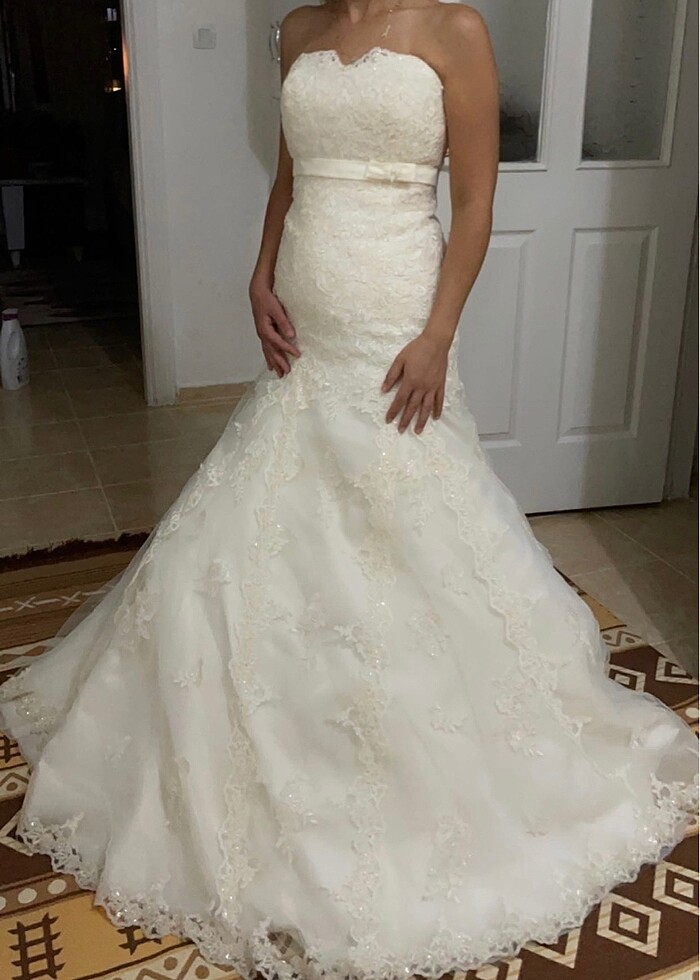 Dreamon gelinlik, yırtık vs yok, balık model, göğüs altındaki şerit kurdele çıkabilir.