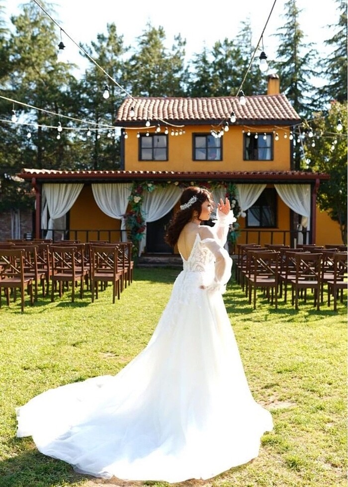 Dantel işlemeli, V yaka, dantel kol detaylı, kırık beyaz. Boyum 1.57 12 cm topuklu ayakkabı ile giydim. Daha uzun bir kişi bile rahatlıkla giyebilir. Ankara içi deneme yapabilir. #aysiragelinlik #aysira Etek kısmı hareketli çok göz yorduğu için onu düz kendinden parıltılı bir tül seçtik.