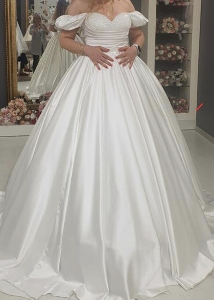38 beden 1 60 1.65 boya uygun özel moda evine diktirilmis gelinlik ipek saten ve yakası inci işlemeli tarlatanı ile birlikte .