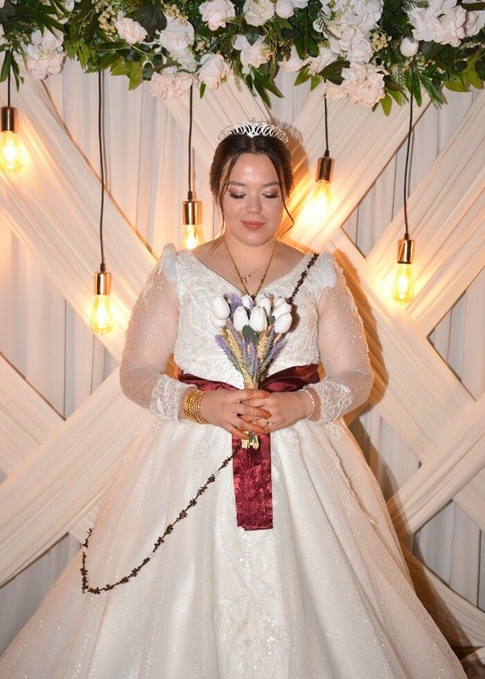 Özel dikimdir. Kibar naif Bi gelinlikler. Çok kabarık değildir. 95 kilo. 160 boy da kullandım. Arka. Etek kısmı biraz daha uzundur. Arkası fermuarlı ve iplidir. 85-105 kilo arası tercih edebilir. Pazarlık payı vardır. Bem 28 bine diktirdim etek kısmında ufak yırtılma oldu fiyatı uygun tuttum o yüzden ama dikildi.