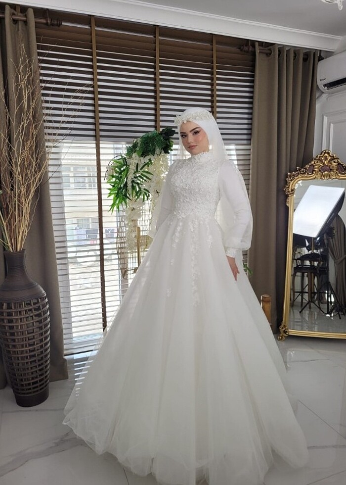 Bir kere giyildi :) tacı var. Türban olarak tül kullanıldı fakat sökerken deforme olduğu için türbanı yok. 38 beden fakat arkası ipli olduğu için 40 42 bedene ne kadar uyumlu olabilir.