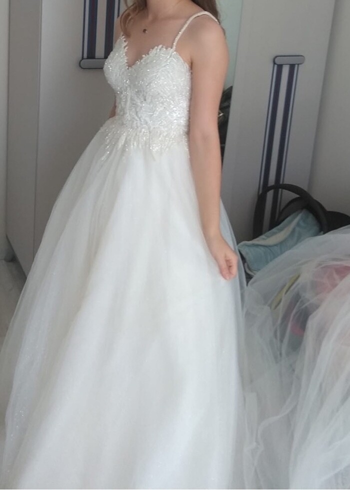 Deformeleri var tül kısmında yakından bakmayla görülebilen omuz iplerinde daraltma yapıldı 56 kilo da giyildi m ve s bedene uygun kuru temizleme yapılması gerekiyor tül duvak mevcut tarlatan mevcut sırt ipi yok.