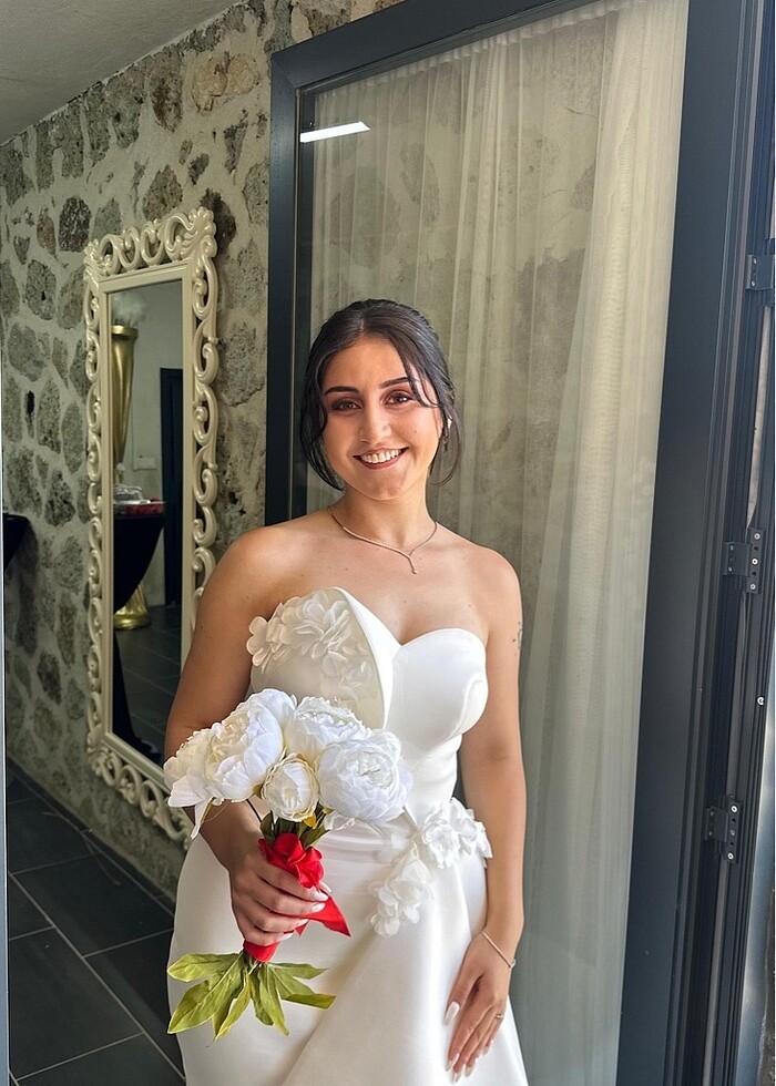 Yırtmaçlı dalgıç kumaş balık gelinlik kuyruğu uzun ve kuyruk ucuna kadar düğme detayı nikahımda giydim üste tam oturuyor vücudu sarıyor kumaş esnek boyum 1.61 kilom 58