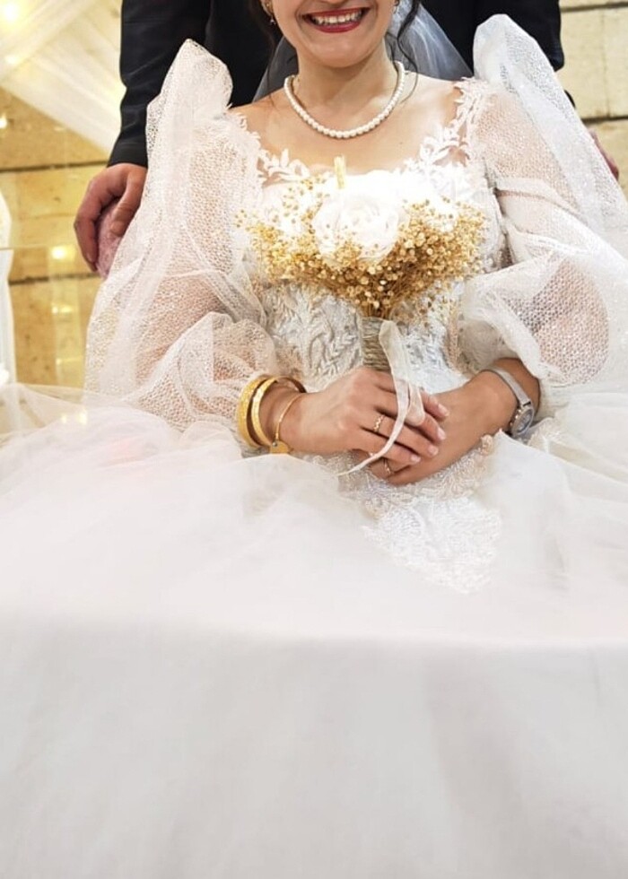 Kendi tasarimimim. 25 Ocak 2025 te düğünumde giydim. Kuru temizleme alıcıya ait.