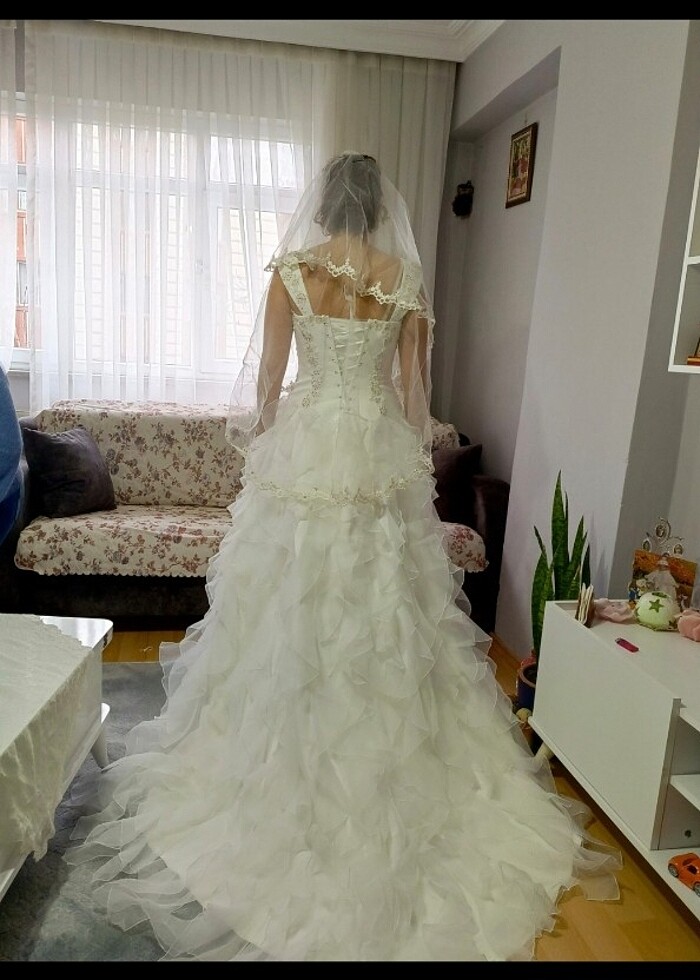 38 bedenin birkaç beden üstüne ve altına rahatça olabileceğini düşünüyorum arkası ipli olduğundan dolayı rahatça olabilir. Bedenim 38 ve fotoğraflarda görüldüğü gibidir. Duvak ve çanta yanında verilecektir. Teklifleri bekliyorum ☺️