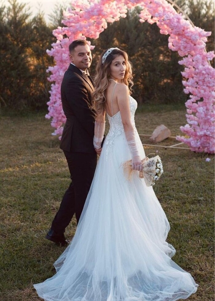Ürün gelinlik . Sadece düğünde ve çekimde kullanıldı . İnce ip askılı ve üst işlemeli . Gelinliğin alt kısmı simli altta işleme yok . Kabarık bir gelinlik değil lakin dar da değil. Ürünün sadece üst tülün en ucunda delik var en son fotoğrafta belirttim isteyen direkt en ucunda olduğu için o kısmı kestirebilir.