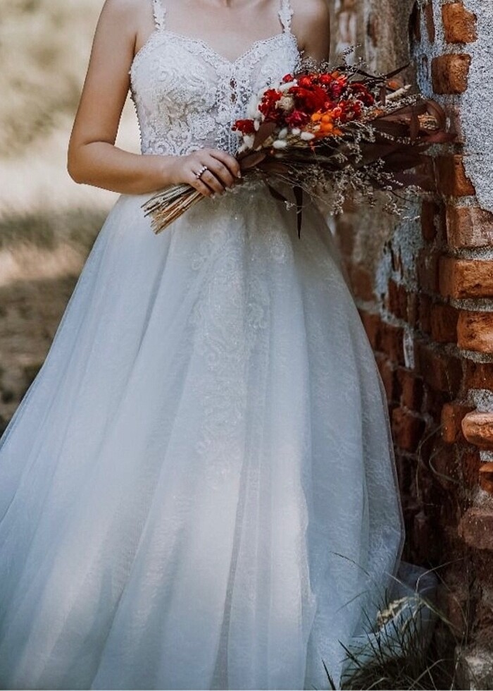 Hafif A kesim sadece yürüme tarlatanı var. Üst kısmı transparan ve işlemelidir. Sırta ayrılan çift askı detayı vardır. 85 beden ile giyilmiştir. Etek kısmında kendinden işlemeleri üzerine bir kat tül bulunmaktadır. Askıları çiçek detaylı sırtı kısmı açık olup v gelmektedir. Kendinden göğüs kulbu vardır. Kuyrukludur. Düz duvakla birlikte gönderilecektir