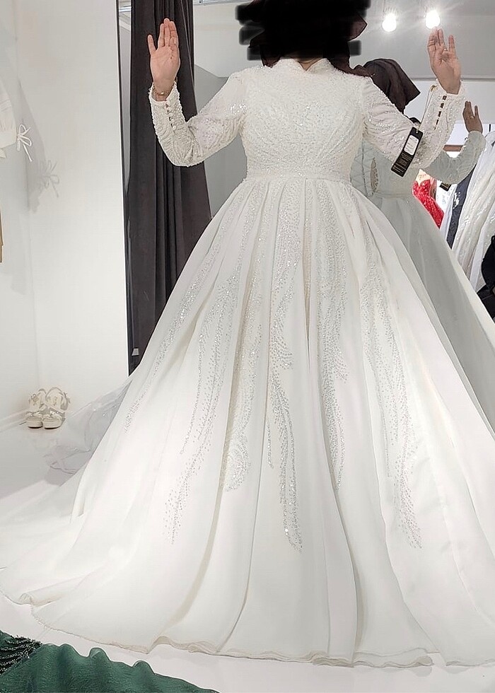 Gelinliği düğün ve çekim günü giydim.Aşırı kabarık bir tarlatanı yok orta kabarıklıkta.Arkası ipli olduğu için 42-44-46 uyumludur.
