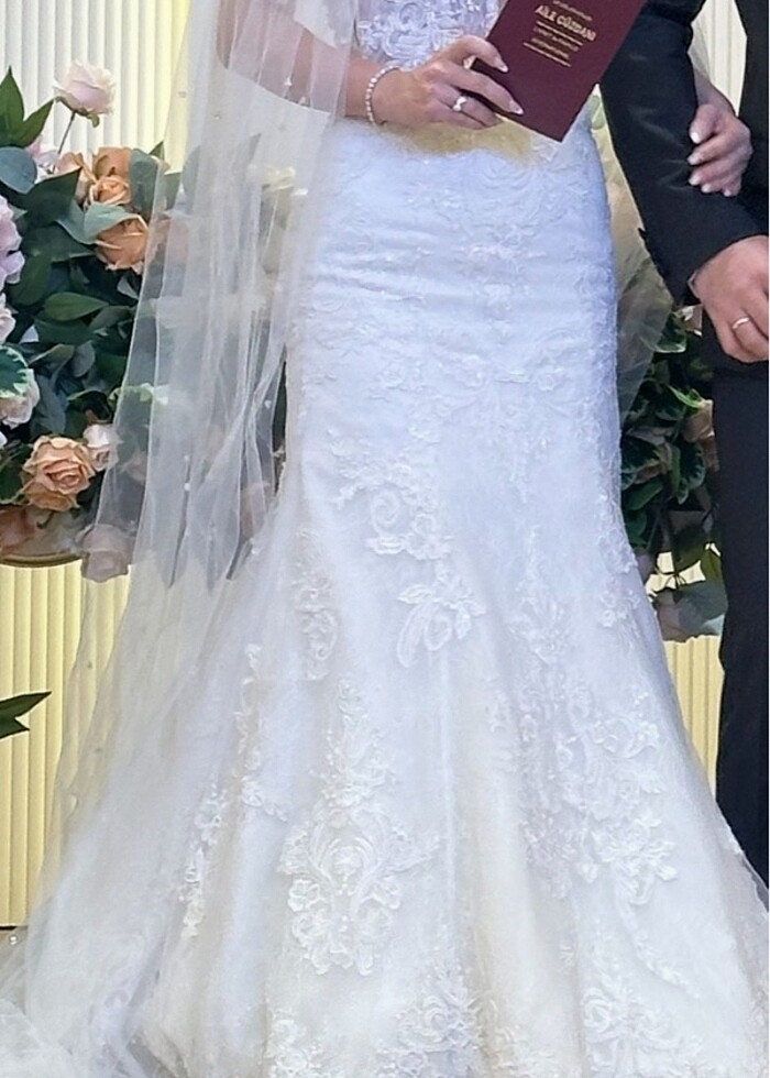 Ürün tertemiz hiç bir sorunu deformesi yok , arka kuyruk kısmı da var uzun . Beden xs - xxs arası olur. 50 kg civarı giyildi . Duvagı ve tarlatanı da var , çiçeği de gönderebiliriz.